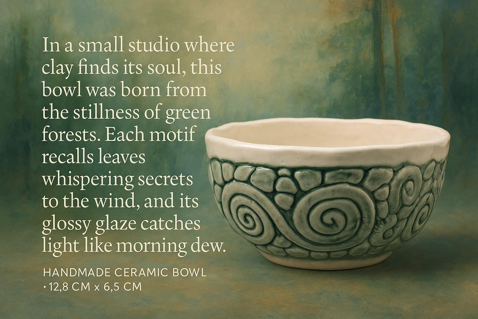 Cuenco de cerámica modelado a mano, con motivos decorativos verdes sobre esmalte brillante. Sus dimensiones (12,8 cm de diámetro x 6,5 cm de alto) lo hacen perfecto para servir alimentos, usar como centro de mesa o simplemente como pieza decorativa. La textura, los tonos y la artesanía hablan de tradición y elegancia natural.